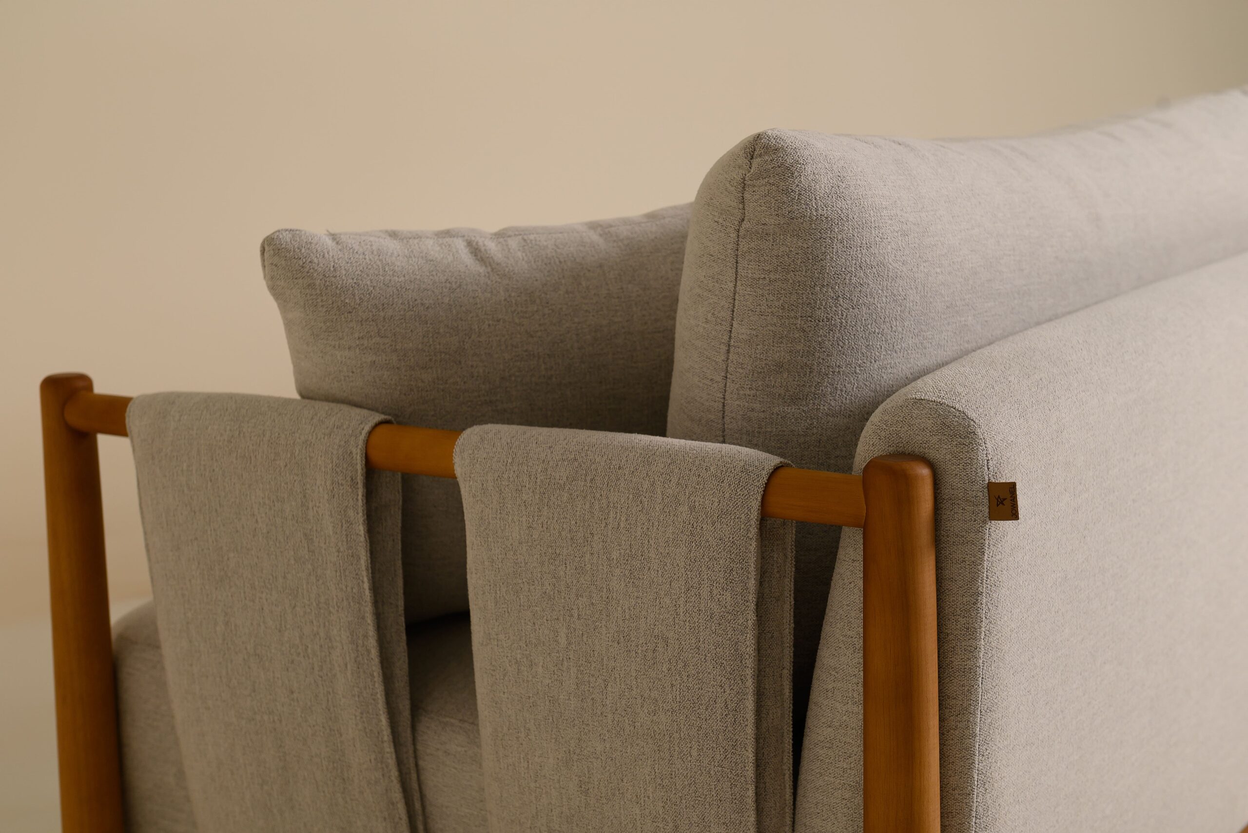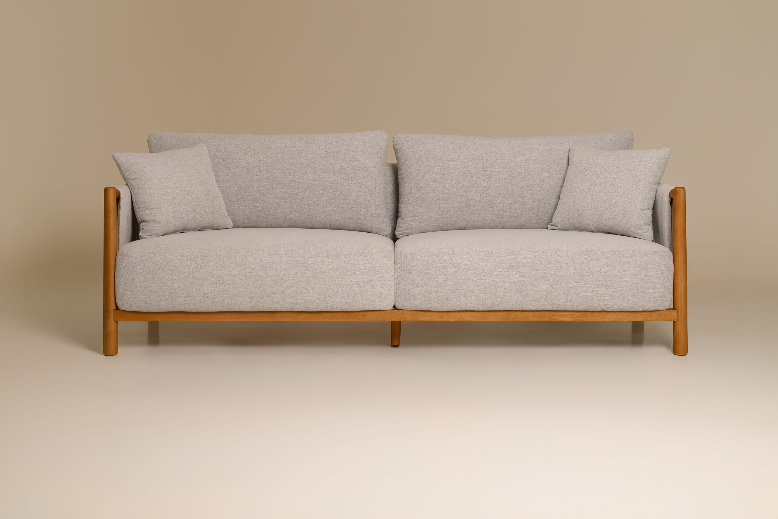 Fixo, recoberto por espuma de densidade D18. Almofadas soltas com fibra siliconizada.