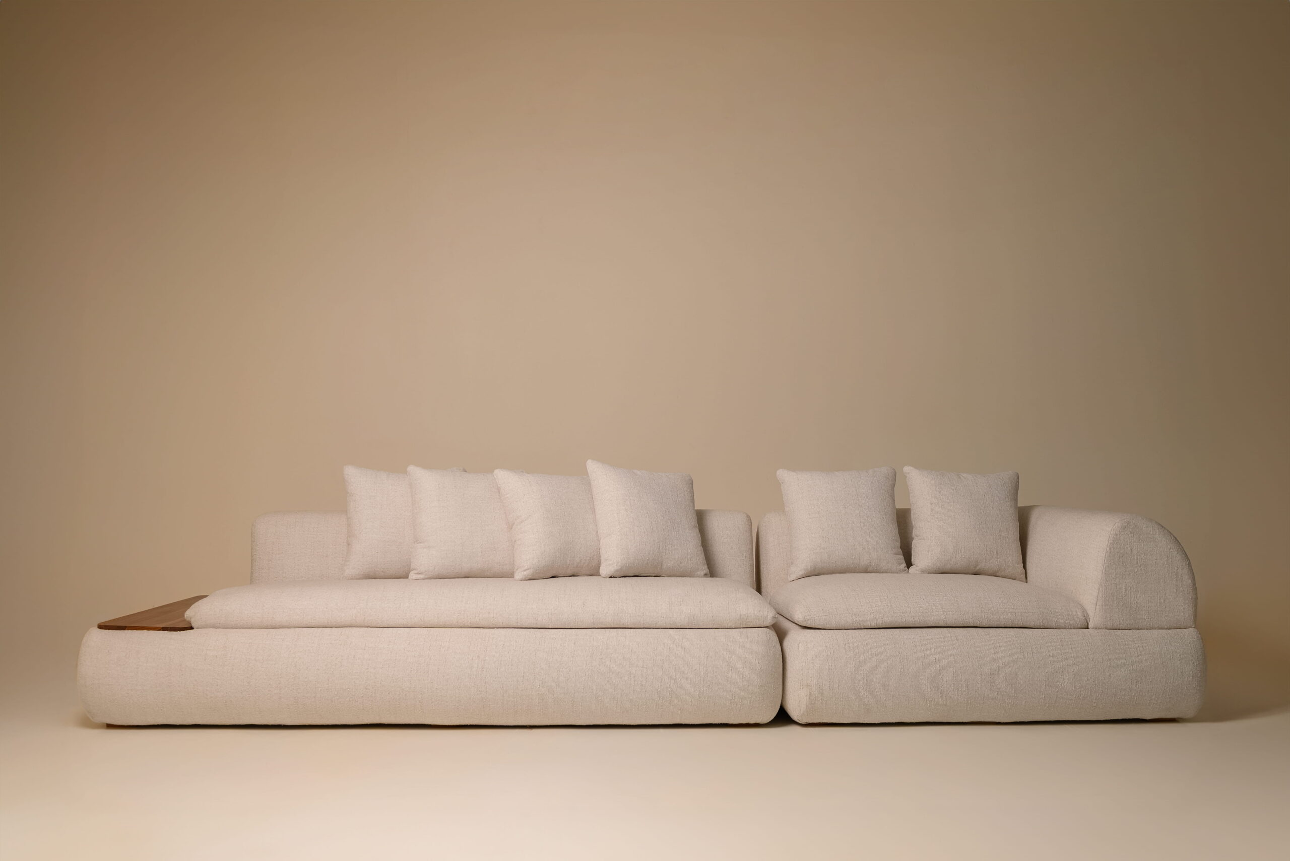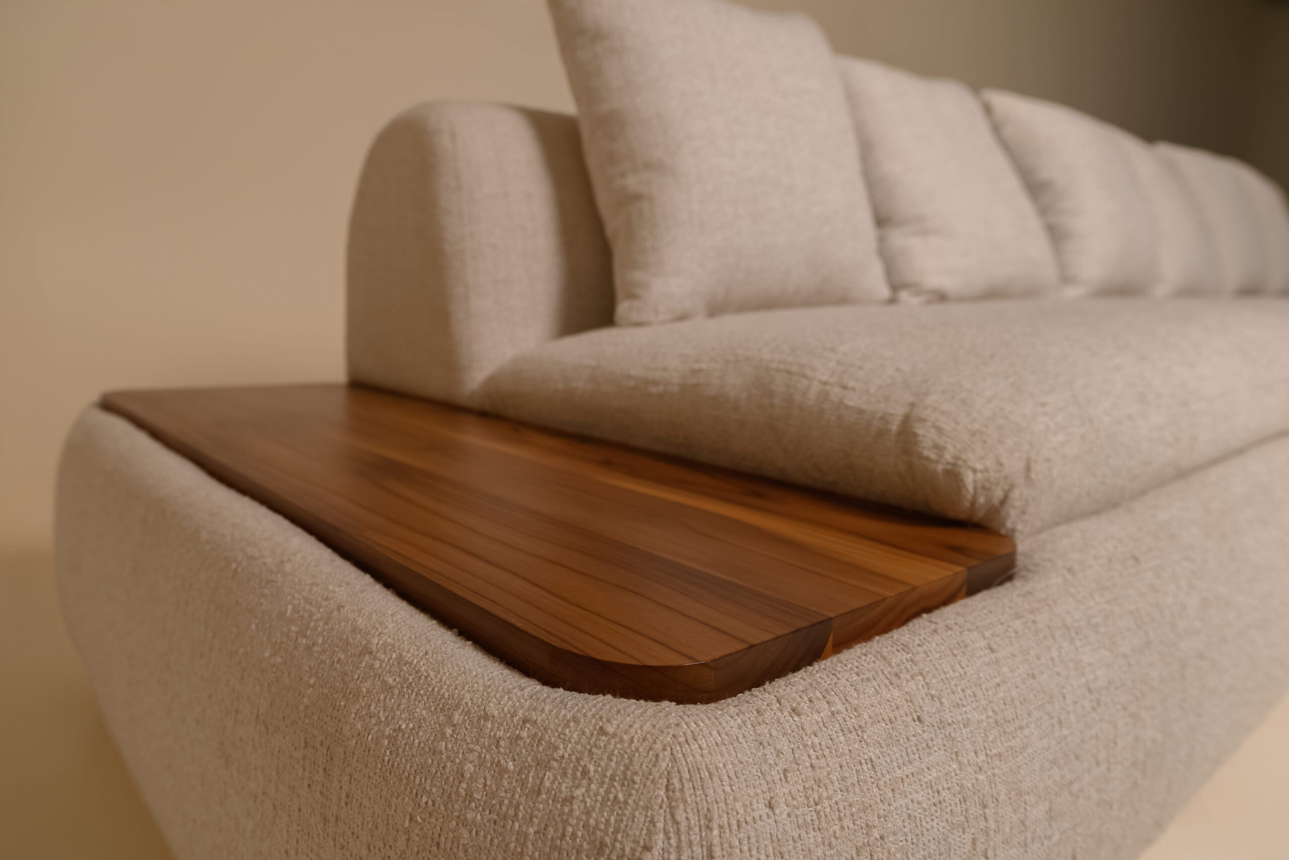 Fixo, recoberto por espuma de densidade D18 ou uma mesa complementar em madeira tauari ou teca.