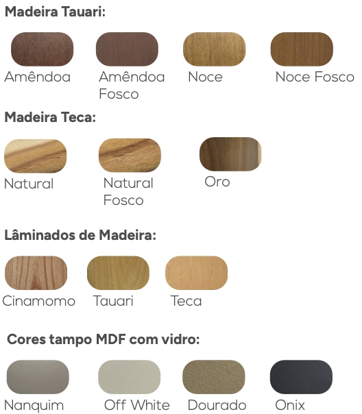 Madeira Tauari com opções de acabamento nas cores: Amêndoa, Amêndoa Fosco, Noce, Noce Fosco. Pé Metal: Dourado, Preto Fosco e Nanquim.