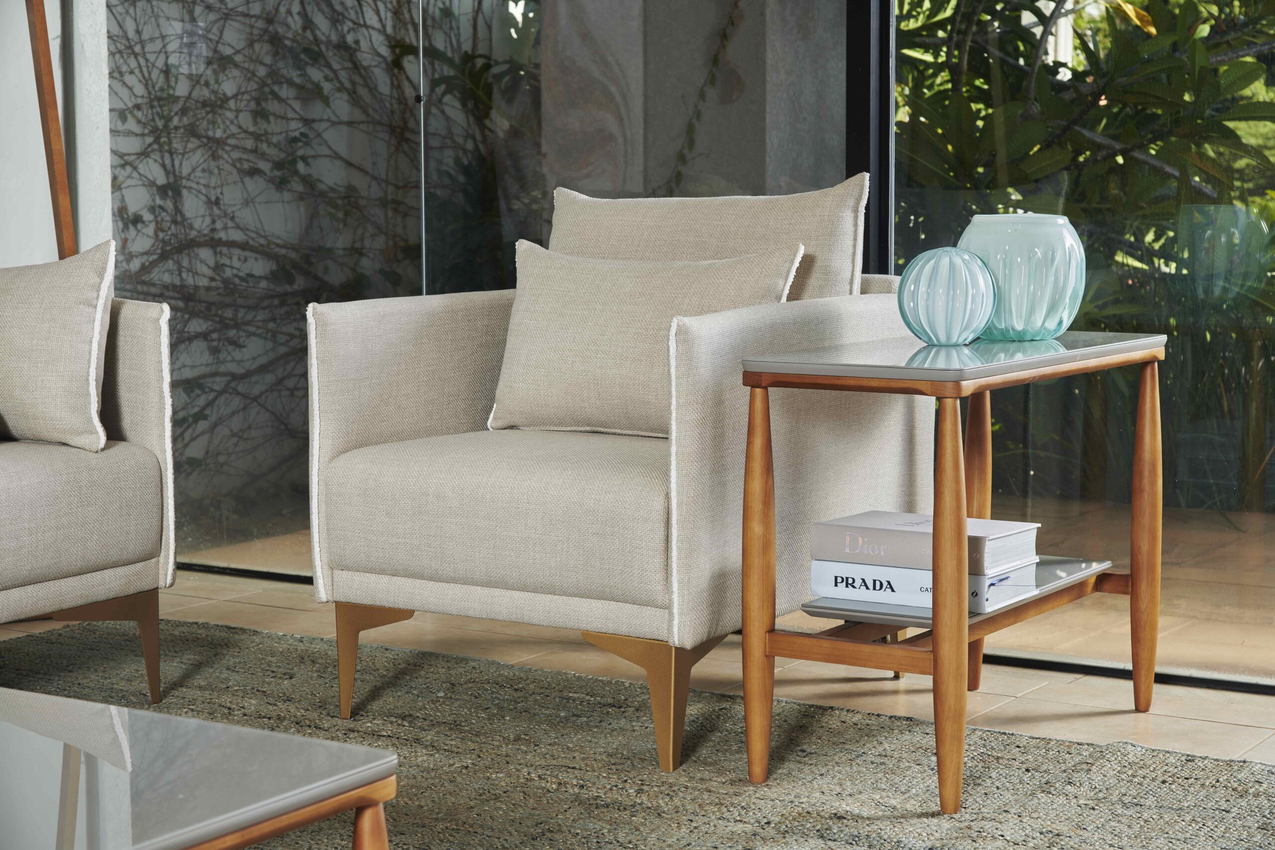 Tampo MDF: Nanquim, Dourado e Off-White. Laminas do tampo: Cinamomo, Tauari e Teca.