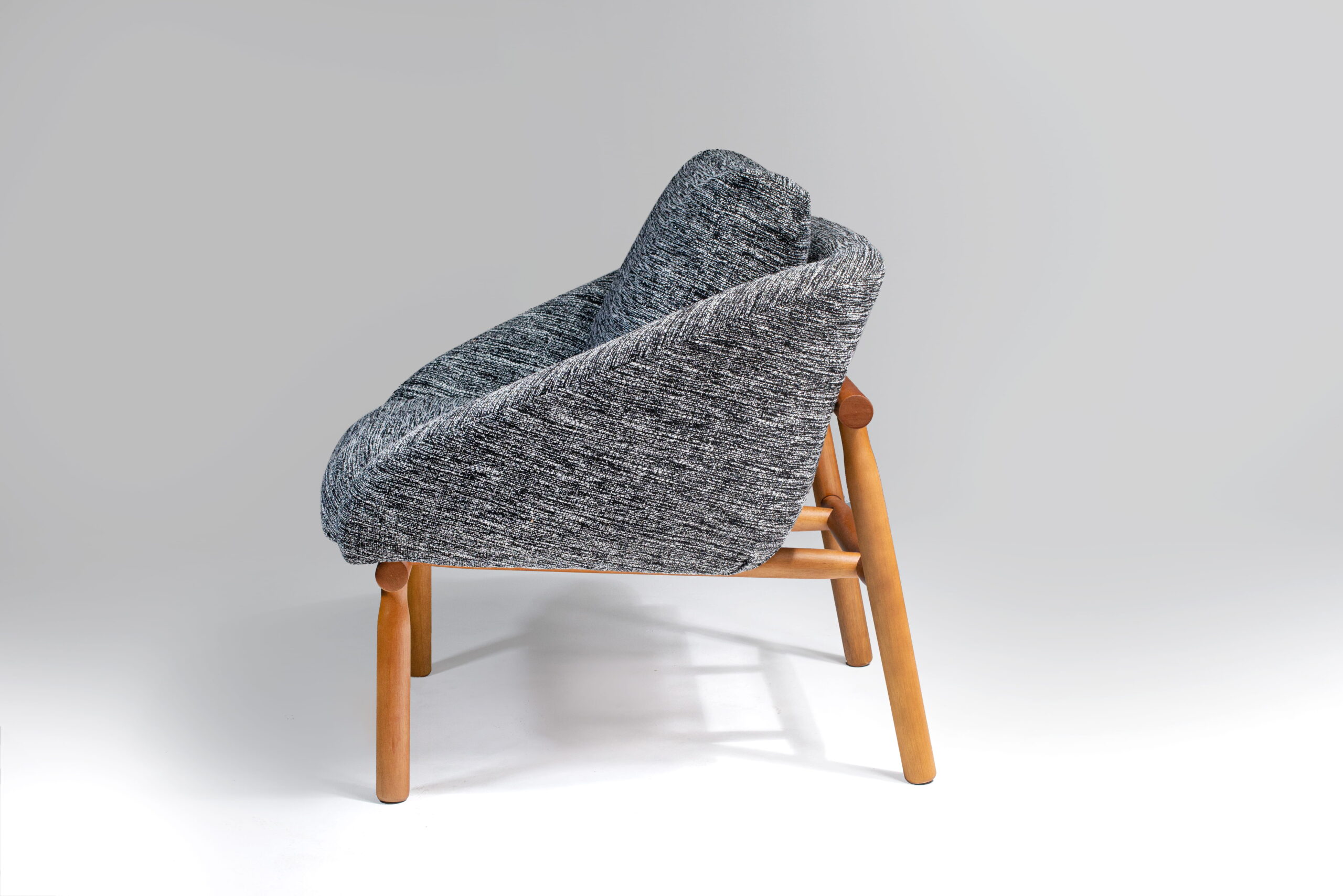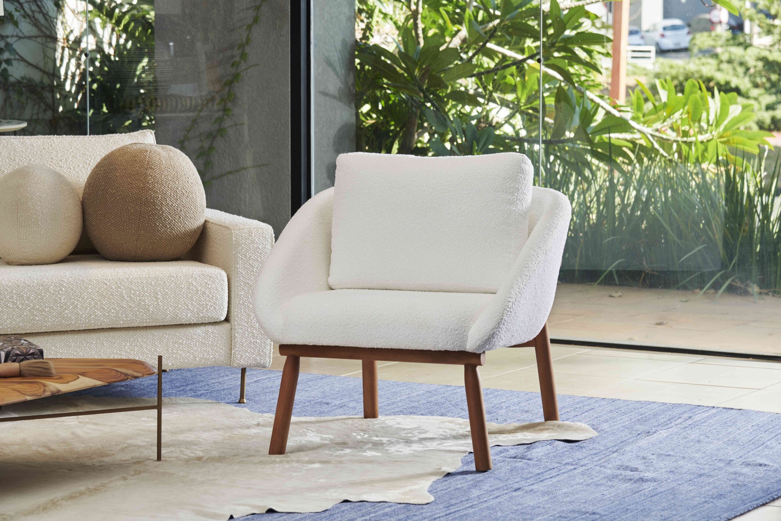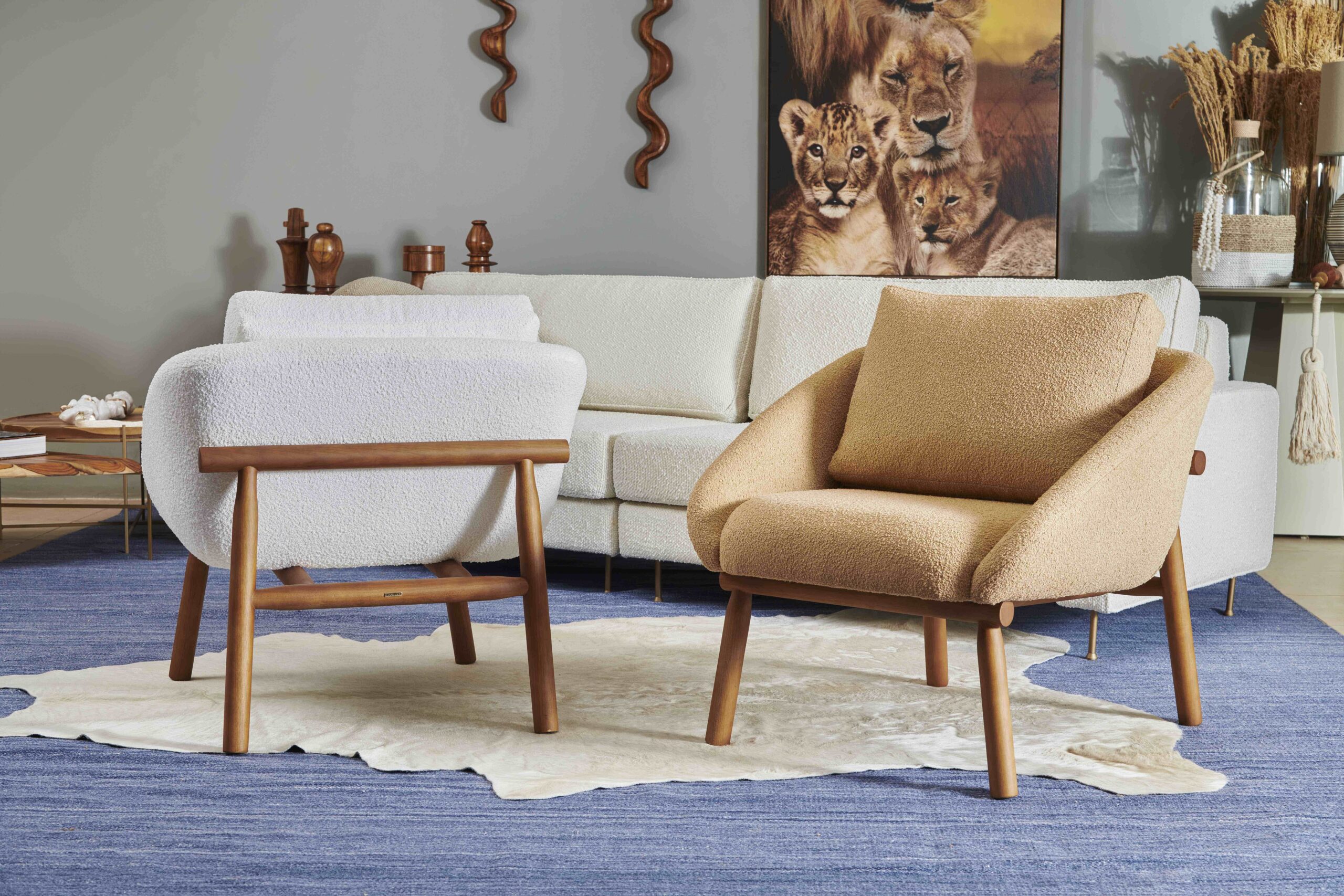 Fixo, com espuma de densidade D18 e almofadas soltas.