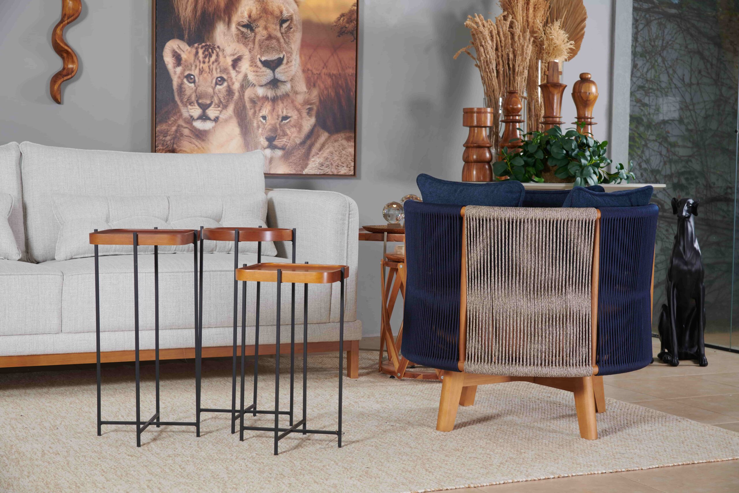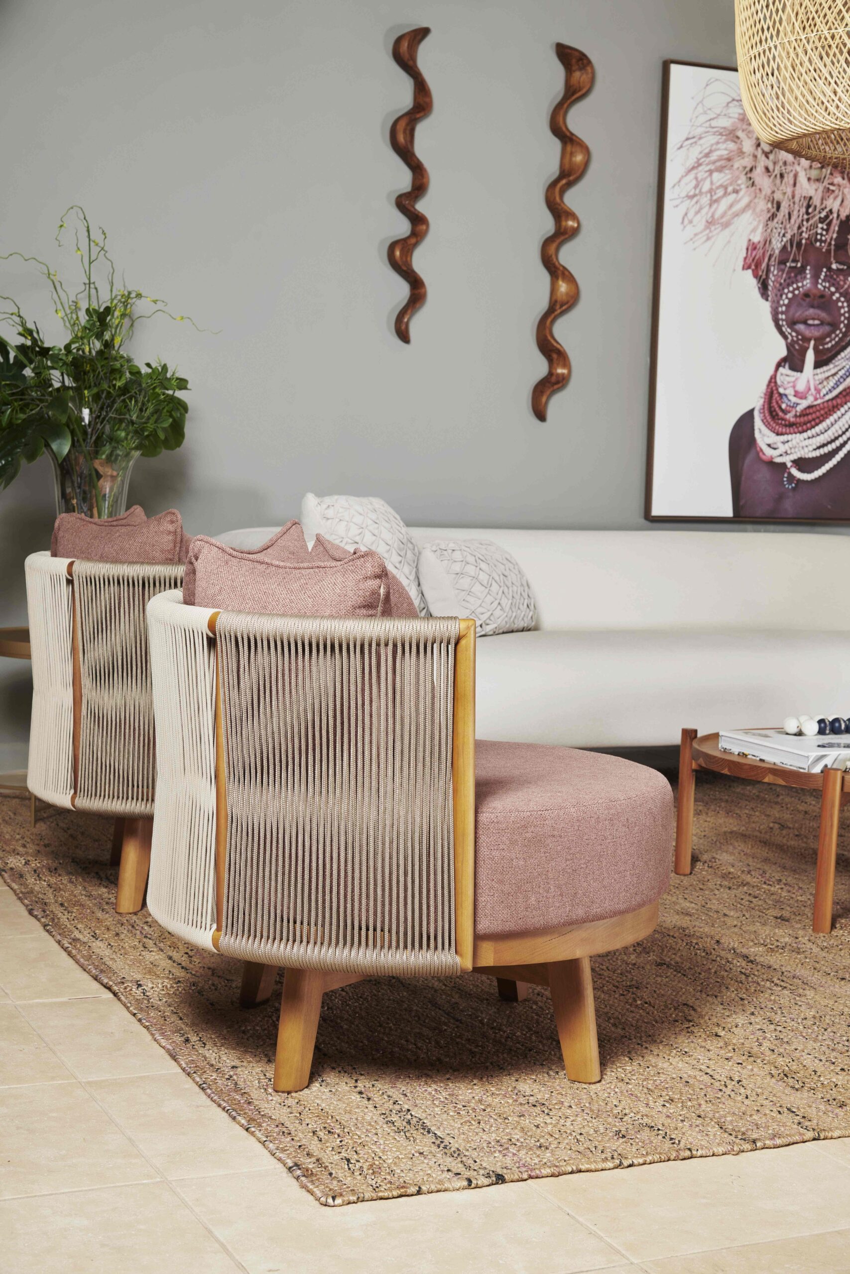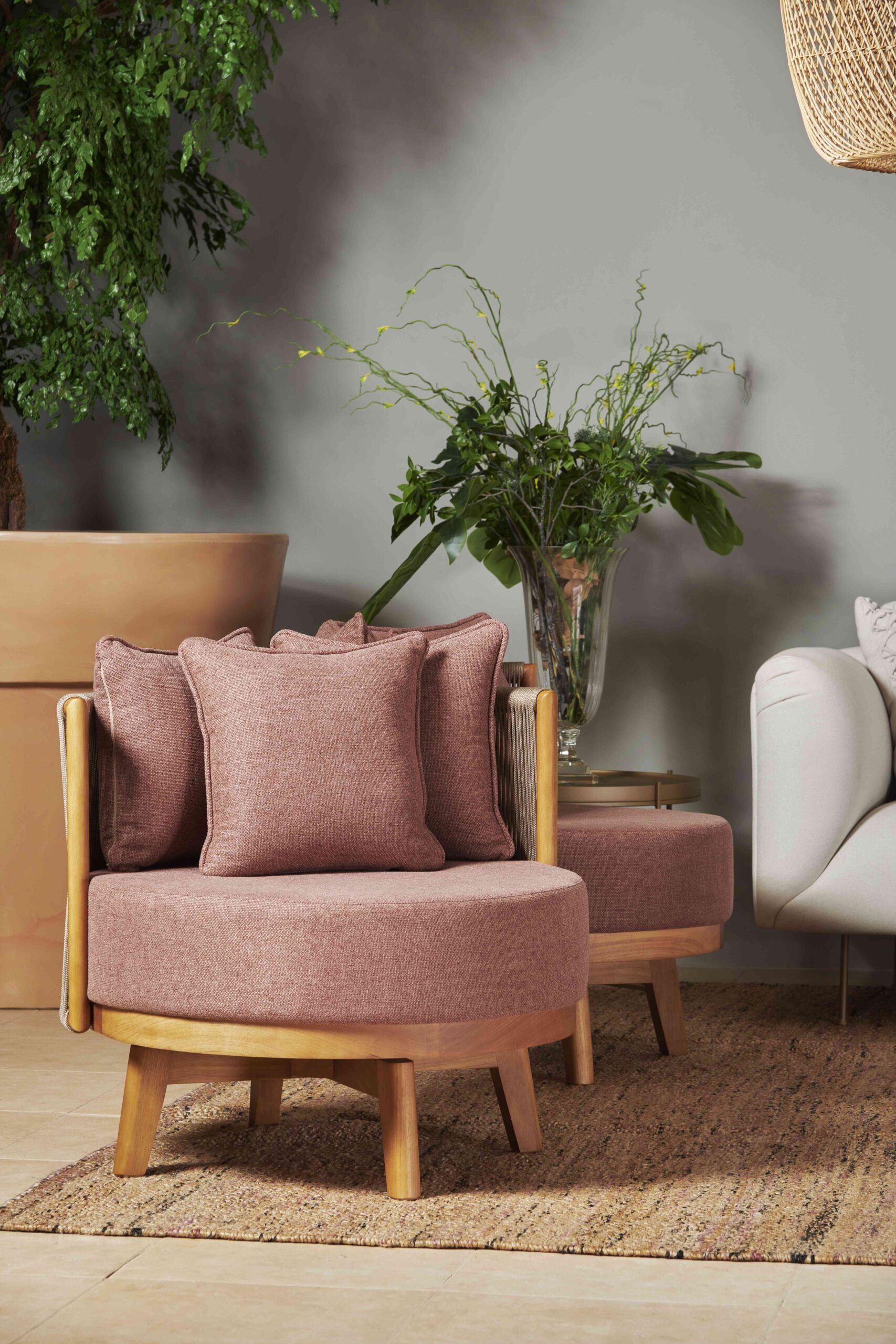 Detalhes em corda trançada e almofadas soltas.