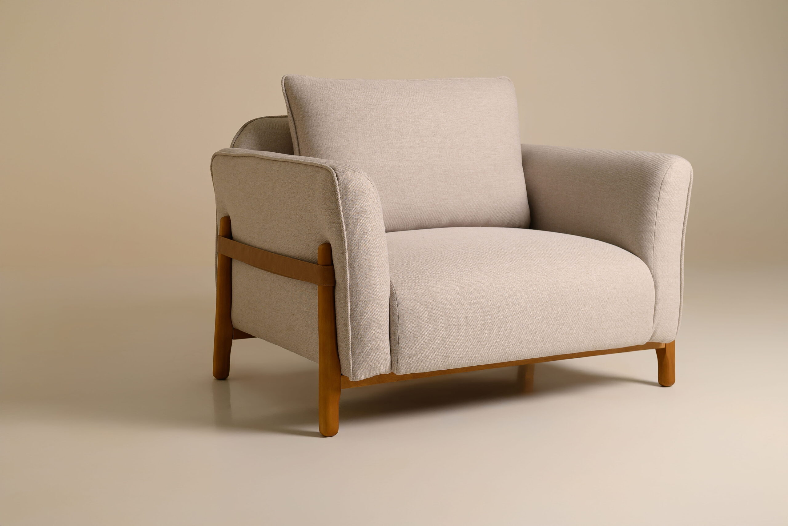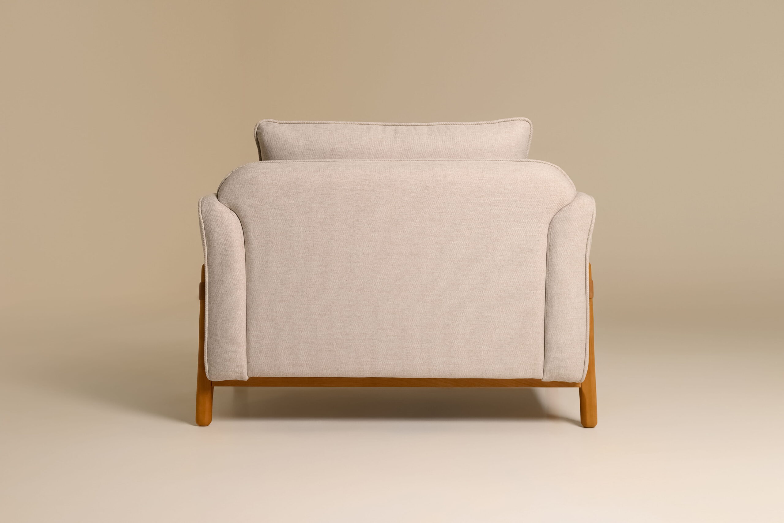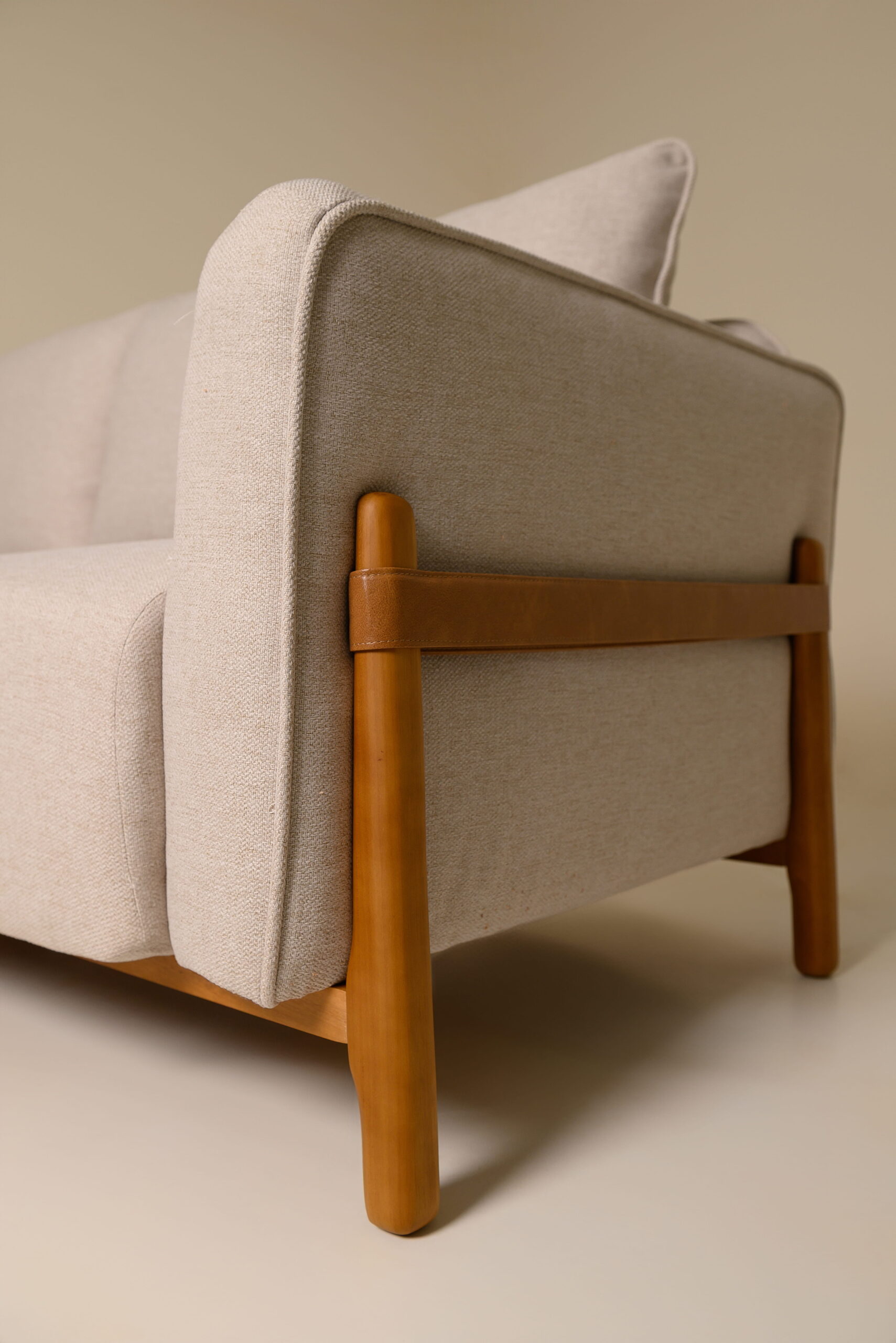 Fixo, recoberto por espuma de densidade D18. Almofadas soltas com fibra siliconizada.